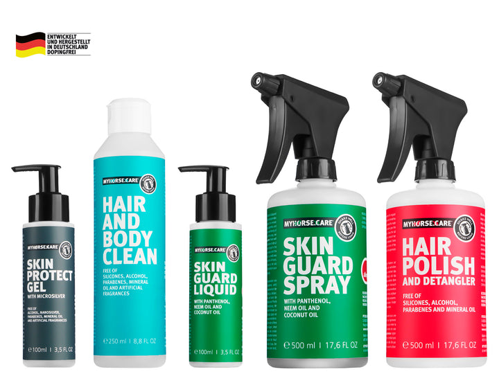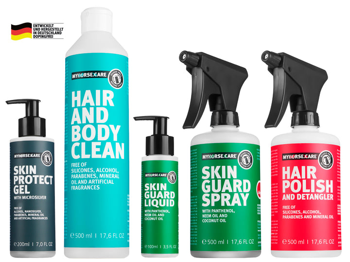 - L (1x Haarpolitur: 500 ml / 1x Hair and Body Clean: 500 ml / 1x Mikrosilbergel: 200ml / 1x Hautschutzliquid: 100 ml / 1x Hautschutzspray: 500 ml)